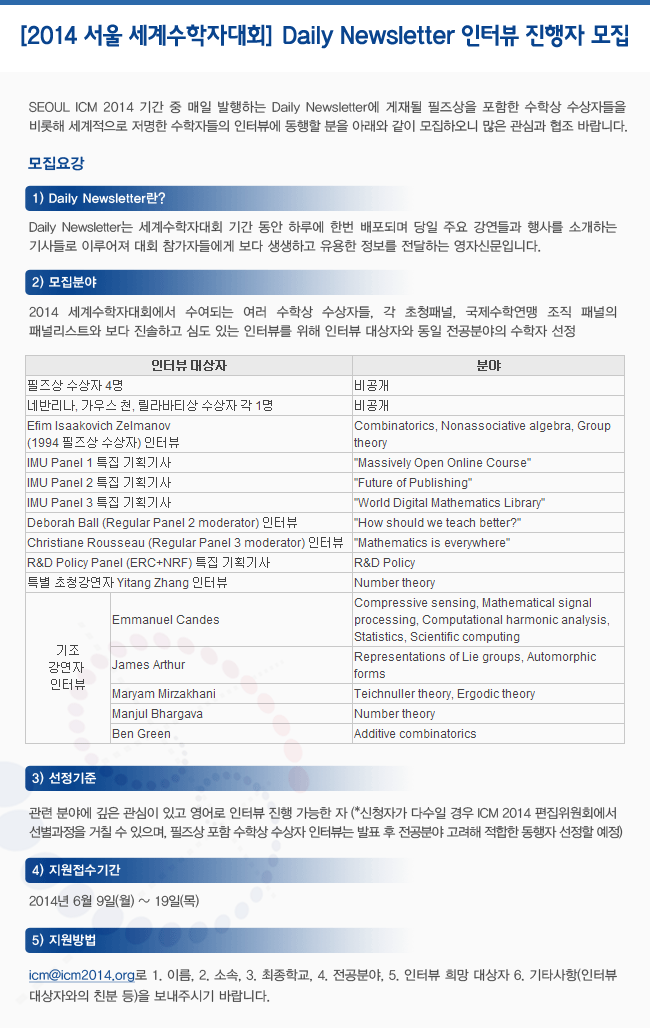 제목 [2014 서울세계수학자대회] Daily Newsletter 인터뷰 진행자 모집